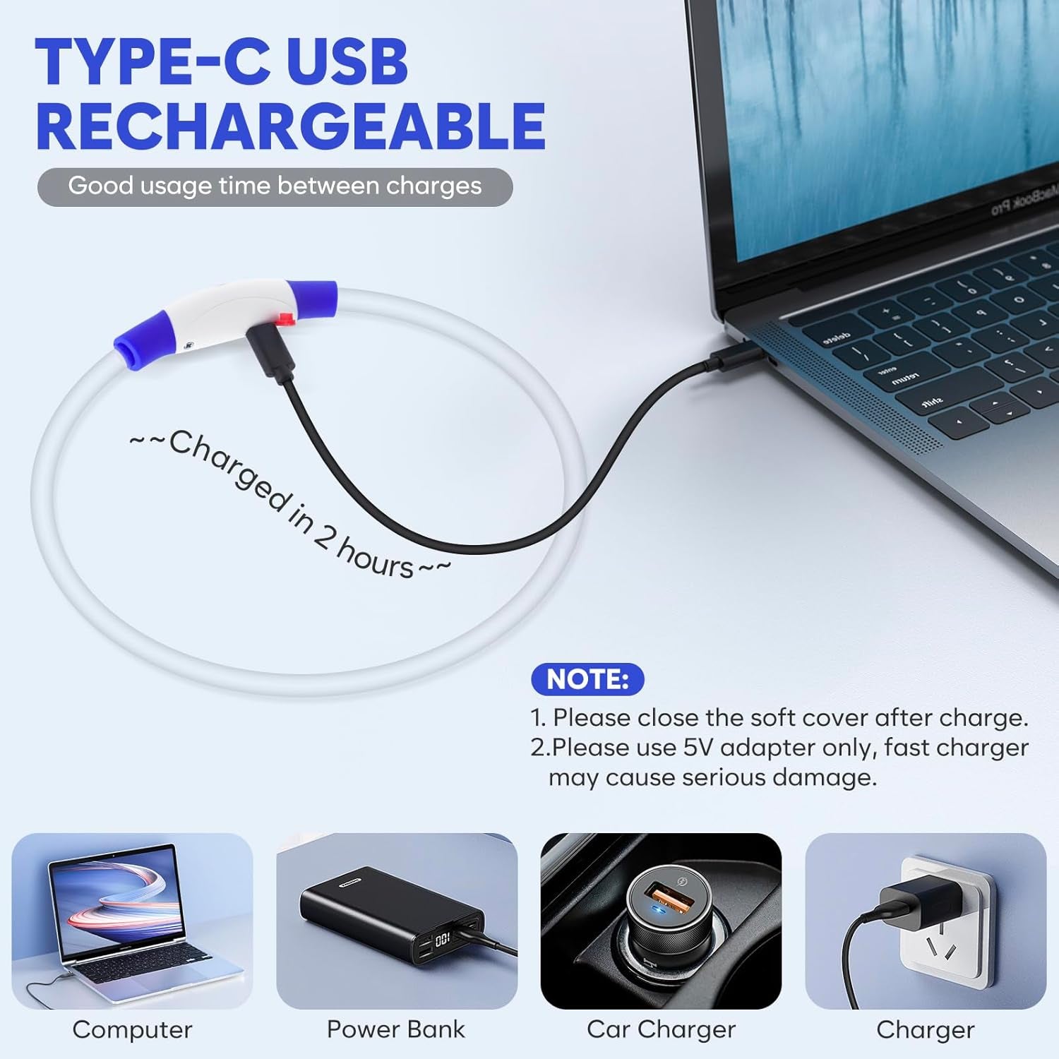 With a Type-C USB port, This flashing safety dog camping light might be charged by Phone Chargers, Laptops, PC's, Tablets, Smart TV's Mains USB Power Adapters. 3 modes available: quick flashing-slow blinking-steady glow-off, just to press the on/off button to choose the modes that you need.