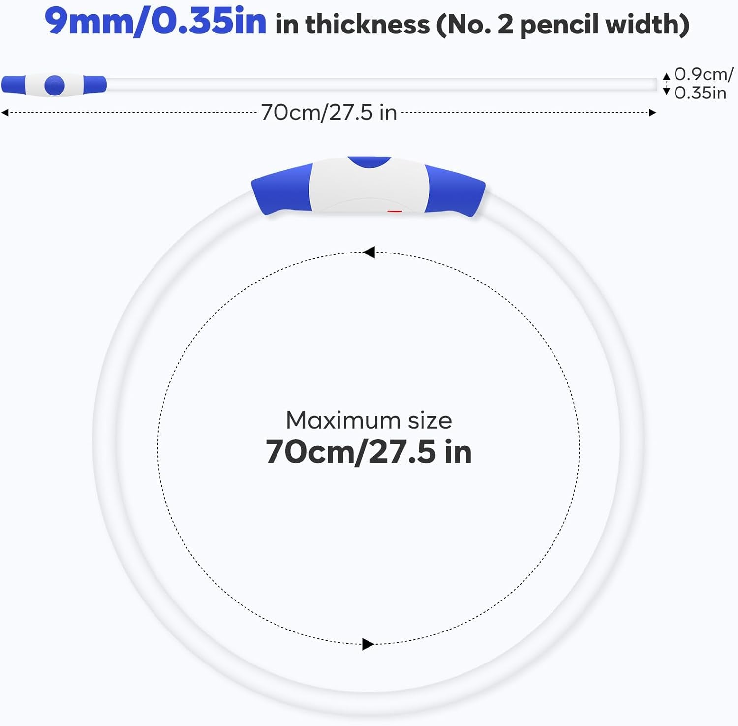 - ADJUSTABLE LIGHT-UP DOG COLLARS & ONE-SIZE SUIT FOR ALL: this led dog collar is made of a clear, firm, and solid TPU light-guiding tube, easily cut into the size that you need according to your dog's neck size. The total length is 27.5 inches(70cm), 9mm in thickness(No. 2 pencil width). Perfect for small, medium, and large dogs, such as spaniels, labradors, hounds, German shepherds, collies, and more